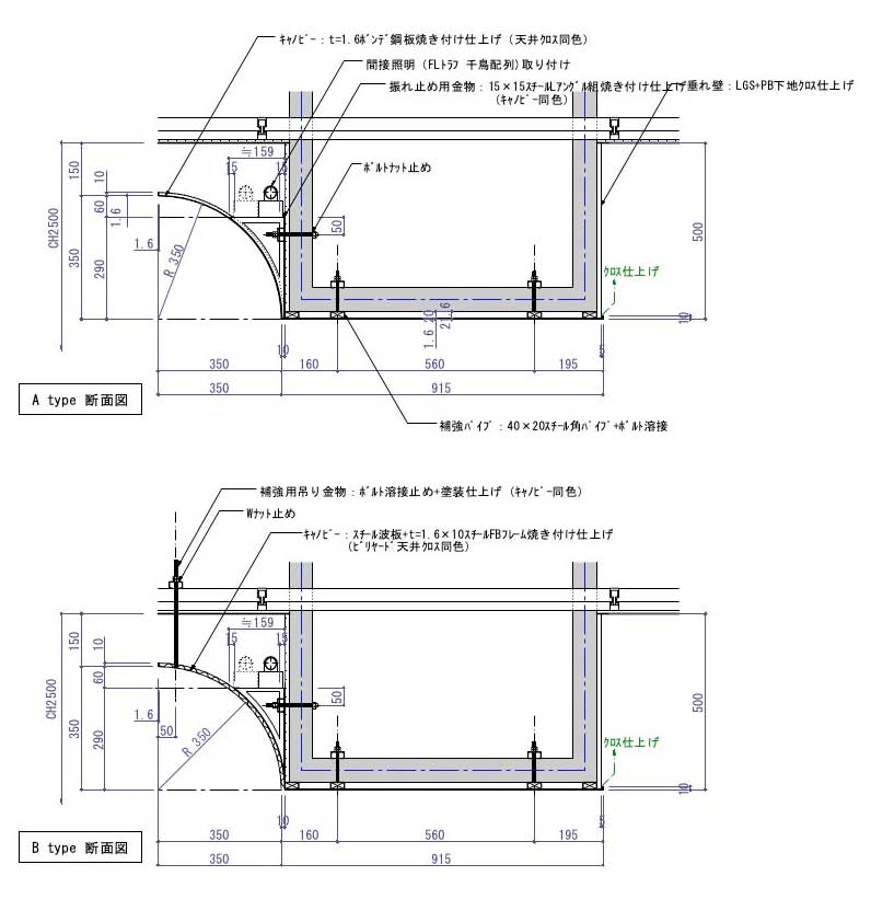 キャノピー:t=1.6ボンデ鋼板焼き付け仕上げ(天井クロス同色)